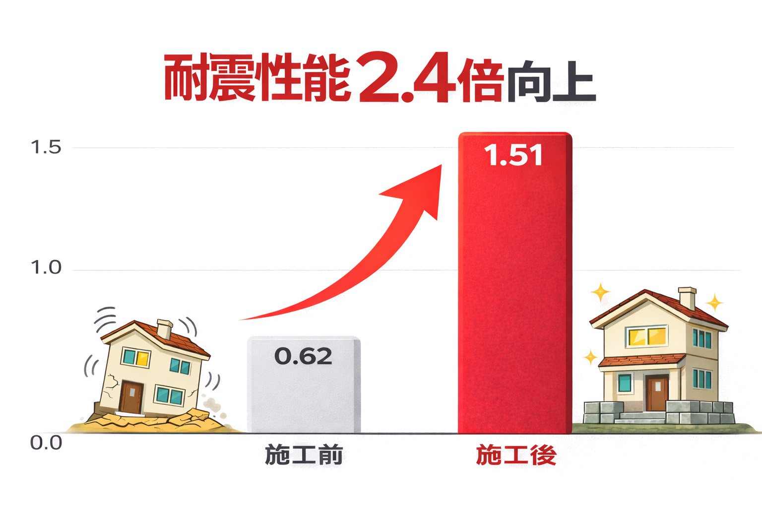 耐震診断に基づいた基礎補強工事・耐力壁の施工により上部構造評点1.00を実現